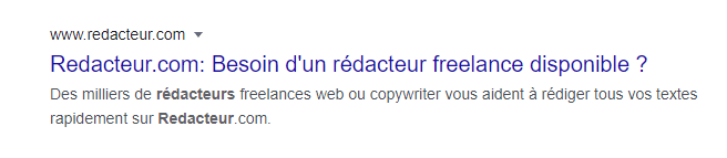Imaginez que l’exemple ci-dessus ait une balise title sans mots d’arrêt. Il apparaîtrait alors comme suit : « Besoin rédacteur freelance disponible ». En supprimant le mot vide « d’un », la lecture est gênée et il est évident qu’il manque une partie du titre. Pour un site spécialisé dans la rédaction, ça la fiche mal !