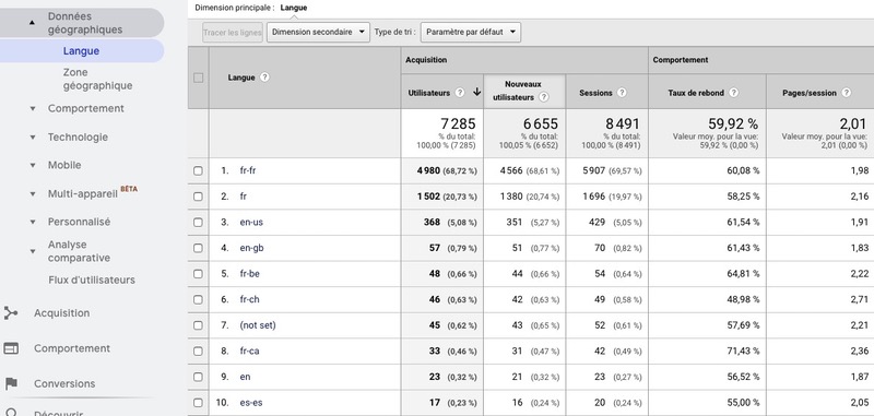 L’objectif est d’identifier les langues et les pays étrangers qui semblent les plus intéressants à exploiter, ainsi que le comportement de vos visiteurs actuels.