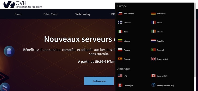 En mettant en place des sous-domaines, les utilisateurs seront invités à choisir leur pays ou leur langue dès leur arrivée sur votre site. Sur OVH par exemple, vous pouvez choisir votre pays en haut à droite de l’interface.
