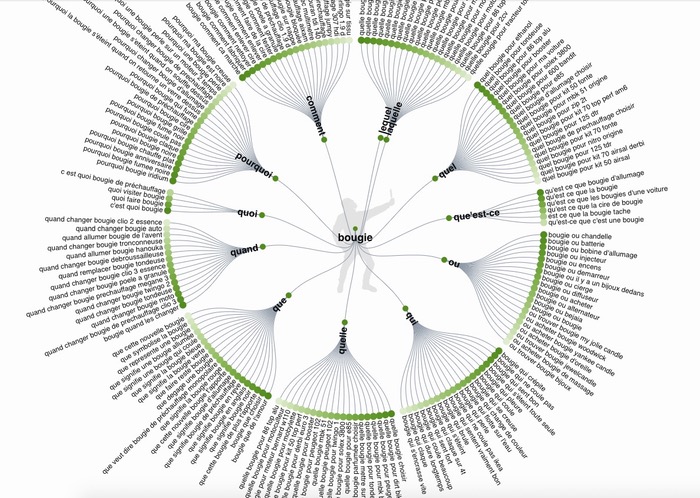Classées par adverbe et présentées sous forme de cercles, les questions vous permettront d’enrichir votre longue traîne, mais aussi, très probablement, d’avoir de nouvelles idées de contenus à concevoir pour satisfaire vos visiteurs.