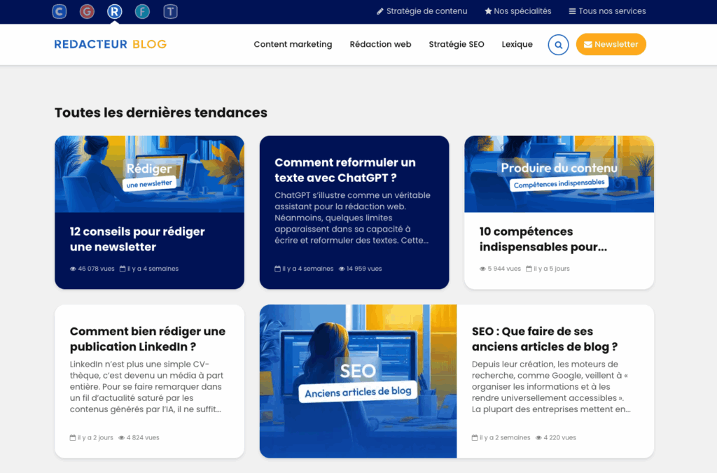 Vous trouverez dans le blog de Redacteur.com tous les articles nécessaires pour optimiser votre site et le faire grimper dans les résultats de recherche : stratégie marketing, outils sémantiques, expérience utilisateur, audit de référencement. Si vous voulez faire une veille marketing pertinente, c’est LE blog à intégrer dans vos outils de veille SEO.