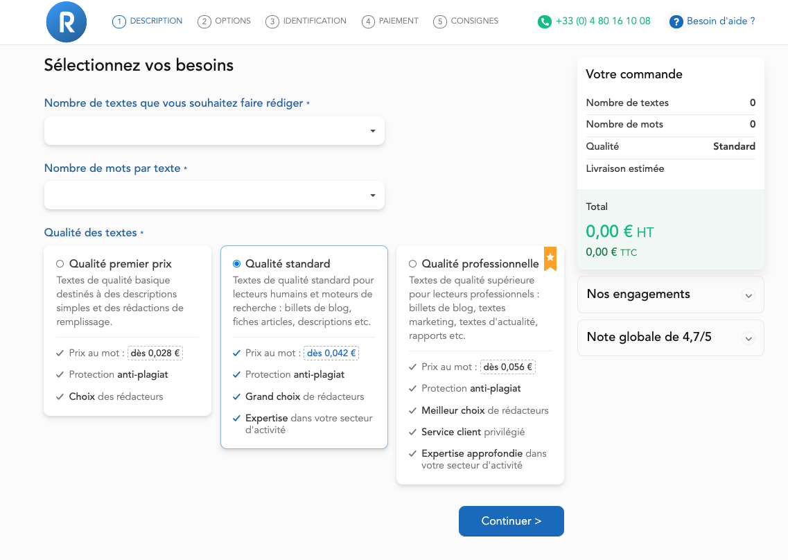 Décrivez votre besoin : indiquez vos consignes de rédaction et Choisissez vos rédacteurs : comparez et choisissez les profils les plus qualifiés pour votre commande. Nos conseillères sont disponibles pour vous conseiller dans votre sélection.